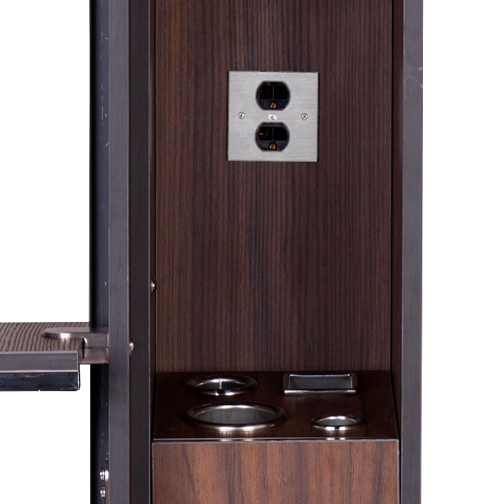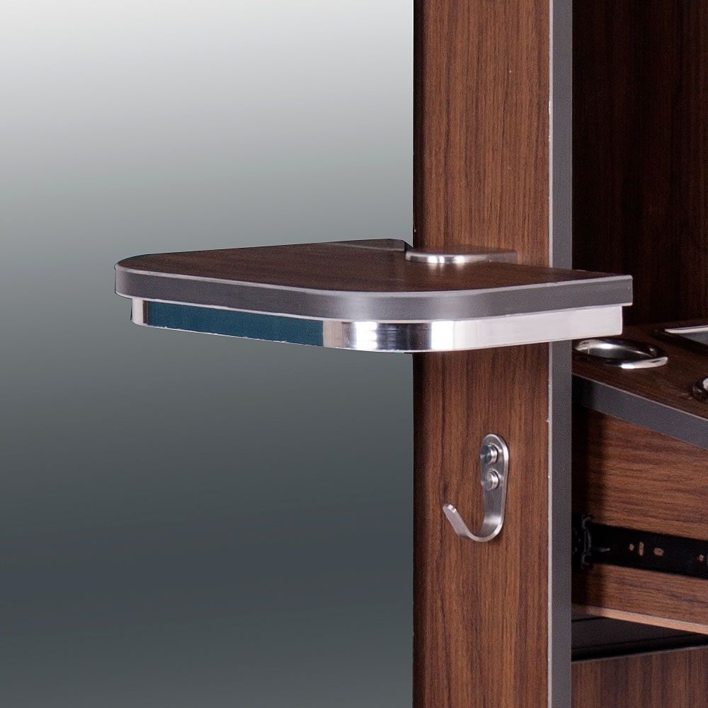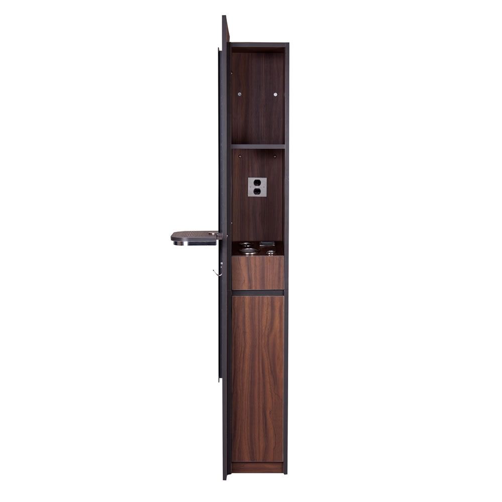 "BURANO" Single Sided Styling Station (SKU: I-061) - Made of quality laminate material. - Available in 3 colours: Matte Black, Dark Walnut and Grey Oak. - Front panel comes with raised mirror, small shelf and handbag hook - Plenty of storage space on both sides - Pull-out appliance drawer on the right side of the station - Appliance drawer includes 3 round holders of different sizes and 1 square holder - Comes with complementary power outlet, however, power cords are not included - Electric cords can come out from the holes in the top, the back or the bottom of the station |