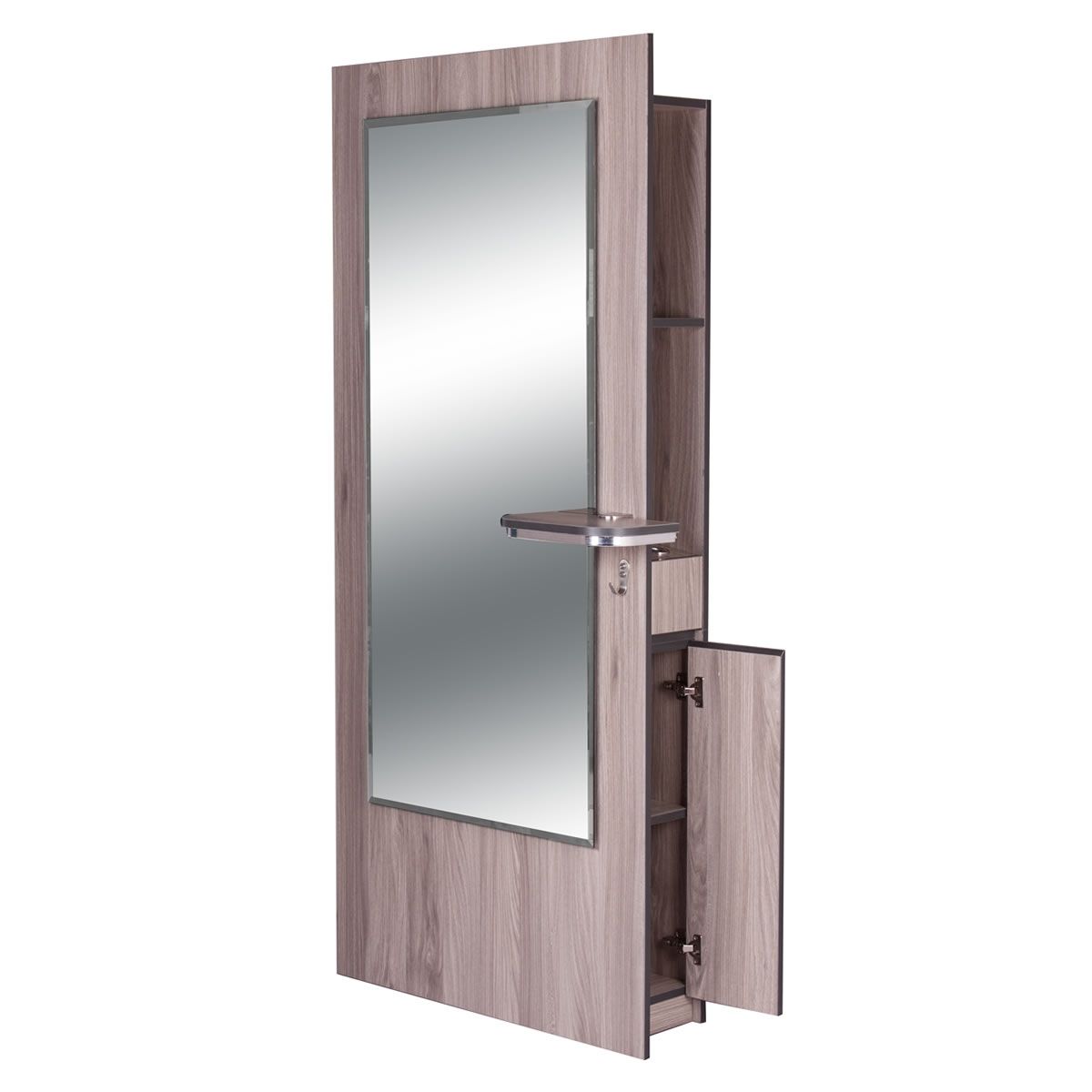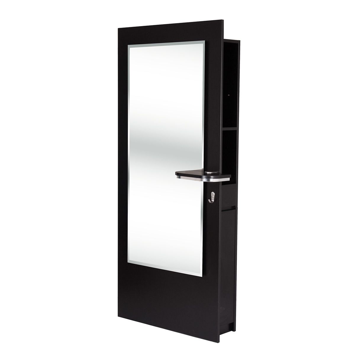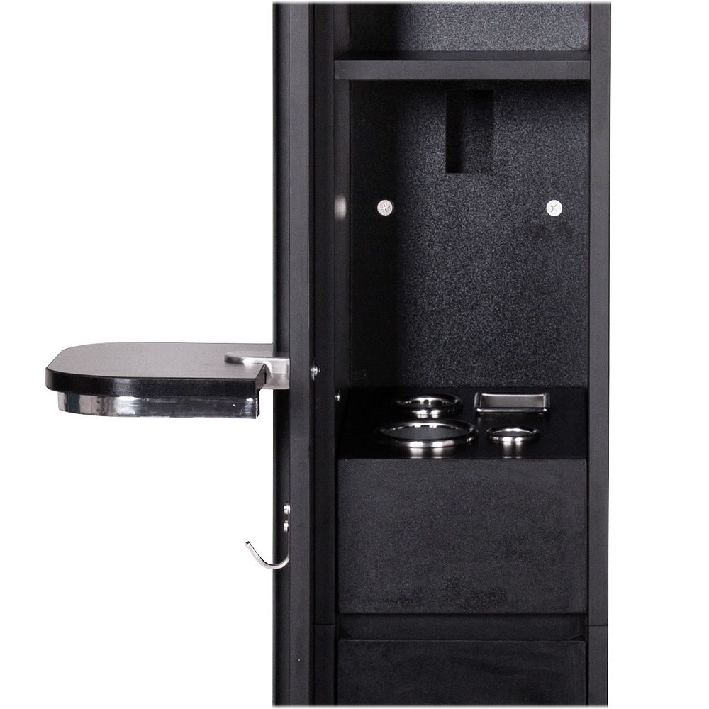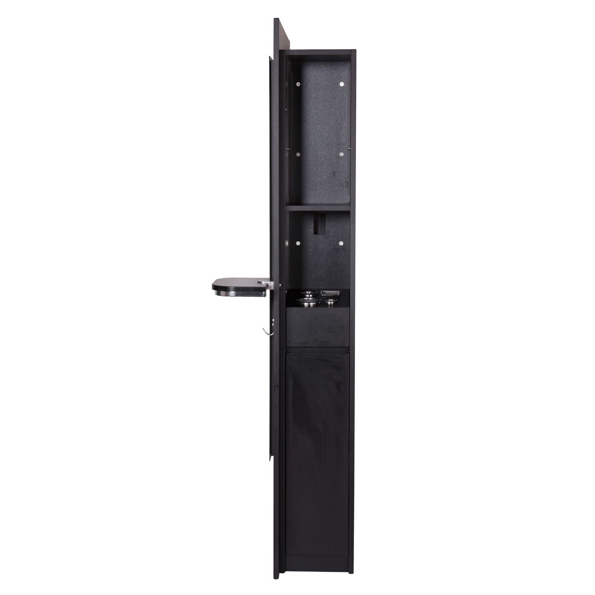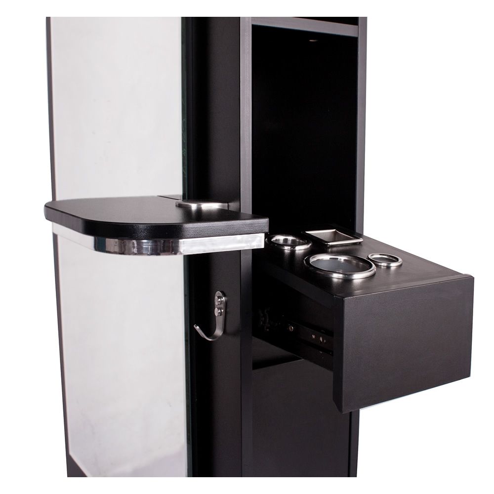 "BURANO" Single Sided Styling Station (SKU: I-061) - Made of quality laminate material. - Available in 3 colours: Matte Black, Dark Walnut and Grey Oak. - Front panel comes with raised mirror, small shelf and handbag hook - Plenty of storage space on both sides - Pull-out appliance drawer on the right side of the station - Appliance drawer includes 3 round holders of different sizes (3", 2", 1.5") and 1 square holder (2.5") - Comes with complementary power outlet, however, power cords are not included - Electric cords can come out from the holes in the top, the back or the bottom of the station |