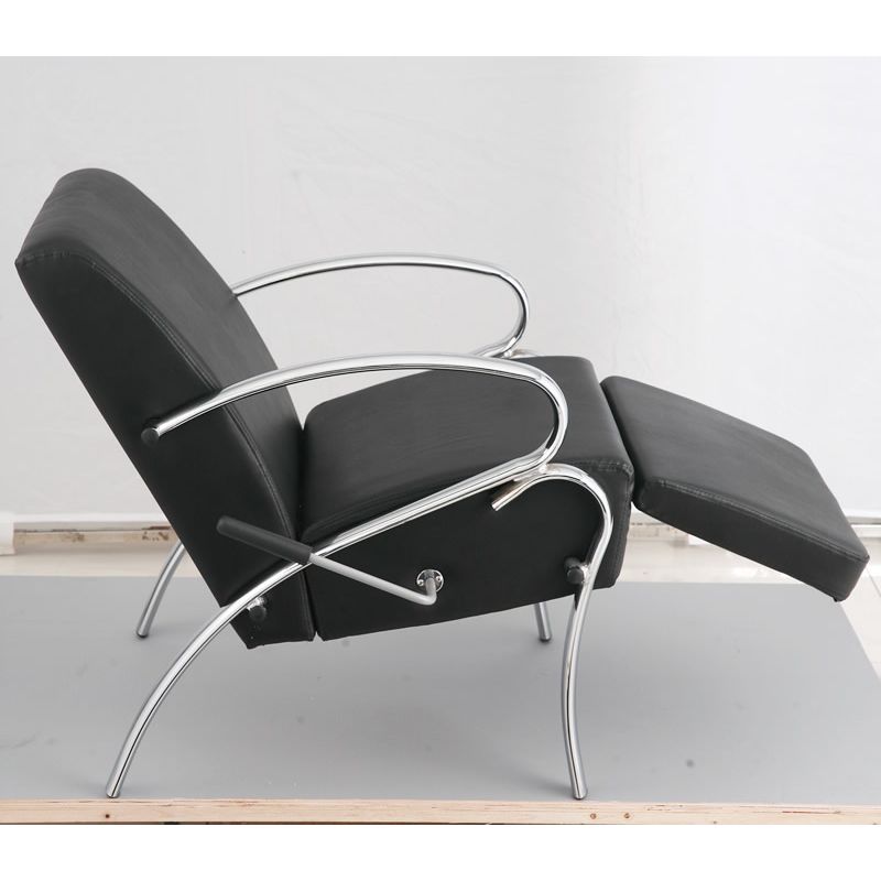 "ATLANTIC" Salon Shampoo Chair (G-017) Lounge shampoo chair with reclinable leg rest. The backrest is well set at a perfect angle into shampoo bowl and leg rest can easily be raised by side lever. The chair is extremely comfortable due to its thick high density foam cushioning. Black and metal combination creates a stylish classic look great for any salons. This chair can be used for its main function as shampoo chair or other purposes such as beauty and spa seating or simply a piece of unique furniture. - 1-year warranty - Black upholstery - Stainless steel arms/legs - Commercial grade smooth vinyl - High density memory foam - Wrapped handle side lever - The shampoo bowl and pedestal are not included - Some assembly required |