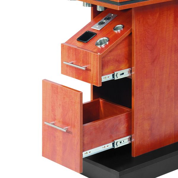 "MALTA" station is made of quality laminate material. It has storage cabinets, drawers and slide-out tools board at both sides. 3 chrome holders are included in each side of the ledge. Each tools board also comes with holders of different sizes. IMPORTANT: This station comes with complimentary power outlets (electrical cords not included), however, we can not guarantee it will pass your state code specifically. You may have to change or modify the outlets/cords, at your own cost, to comply with local codes or regulations. The cords come out either from the top of the station. Free freight shipping with 1-year warranty. Some assembly required |