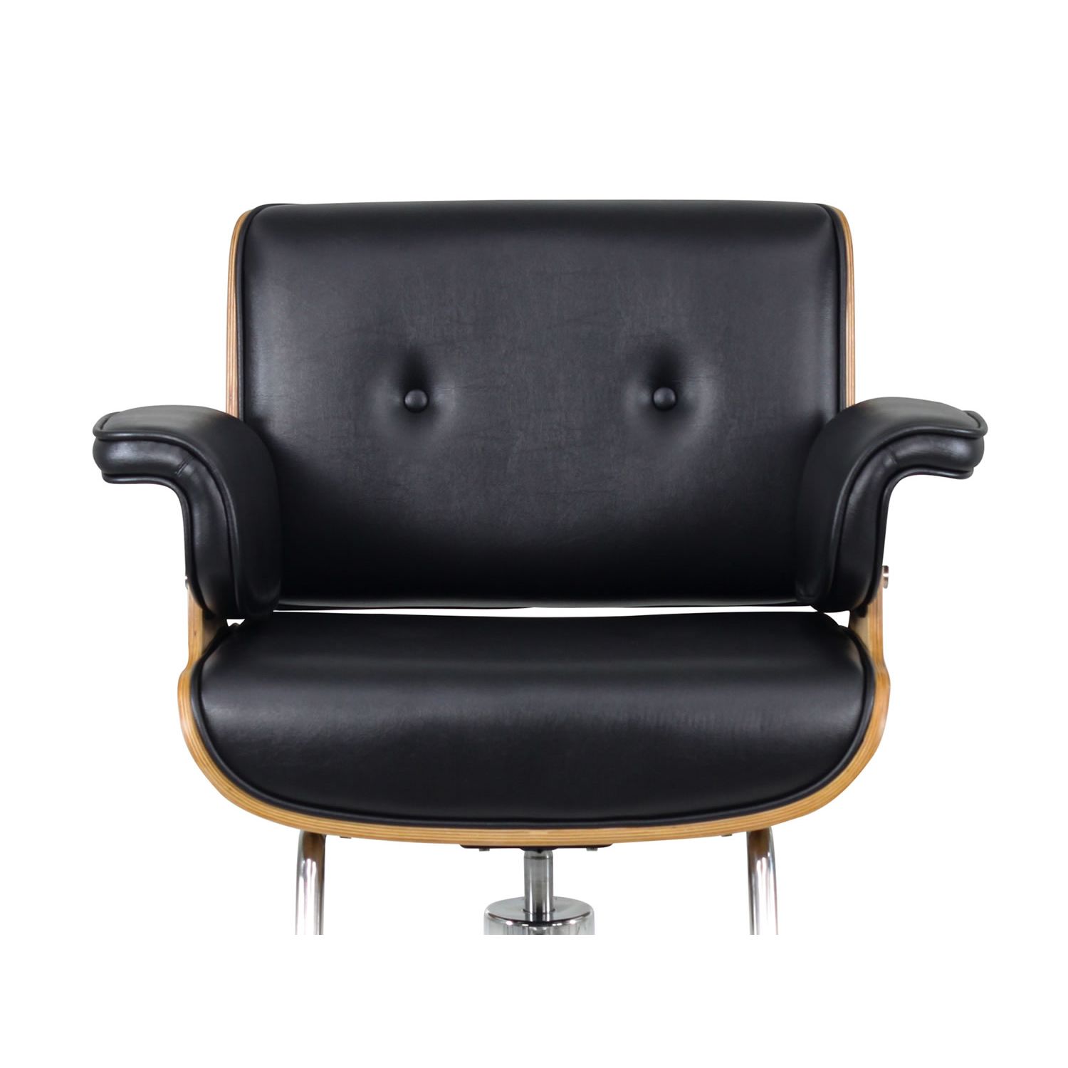 The MIDTOWN MANHATTAN Retro/Classic Salon Chair exudes timeless sophistication, blending a vintage-inspired wooden shell with plush, black leather upholstery. The chair's refined design is highlighted by its warm wood grain, offering a rich contrast to the sleek, cushioned seat and backrest. The gently curved armrests and a polished chrome base enhance the chair's classic appeal, creating a harmonious balance of retro and modern elements. Perfect for any stylish salon, the MIDTOWN MANHATTAN chair brings an air of understated luxury and elegance. - Top-grade smooth vinyl that resembles real leather - Molded high-density foam for superior comfort and extended use - Sleek curved plywood shells for a mid-century modern aesthetic - Features an oversized, heavy duty hydraulic base as standard (Option 7) - Stainless steel U-shaped footrest for added support - Some assembly required |
